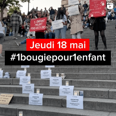 Parvis du sacré cœur de Paris, jeudi 18 mai 2023, des activistes du Collectif Enfantiste, Khadija La Combattante et Justice des Familles ont posé 20 bougies au sol et des dizaines de personnes ont également déposé sur le rebord de leur fenêtre une bougie à l’appel du Collectif Enfantiste pour l’action #1bougiepour1enfant