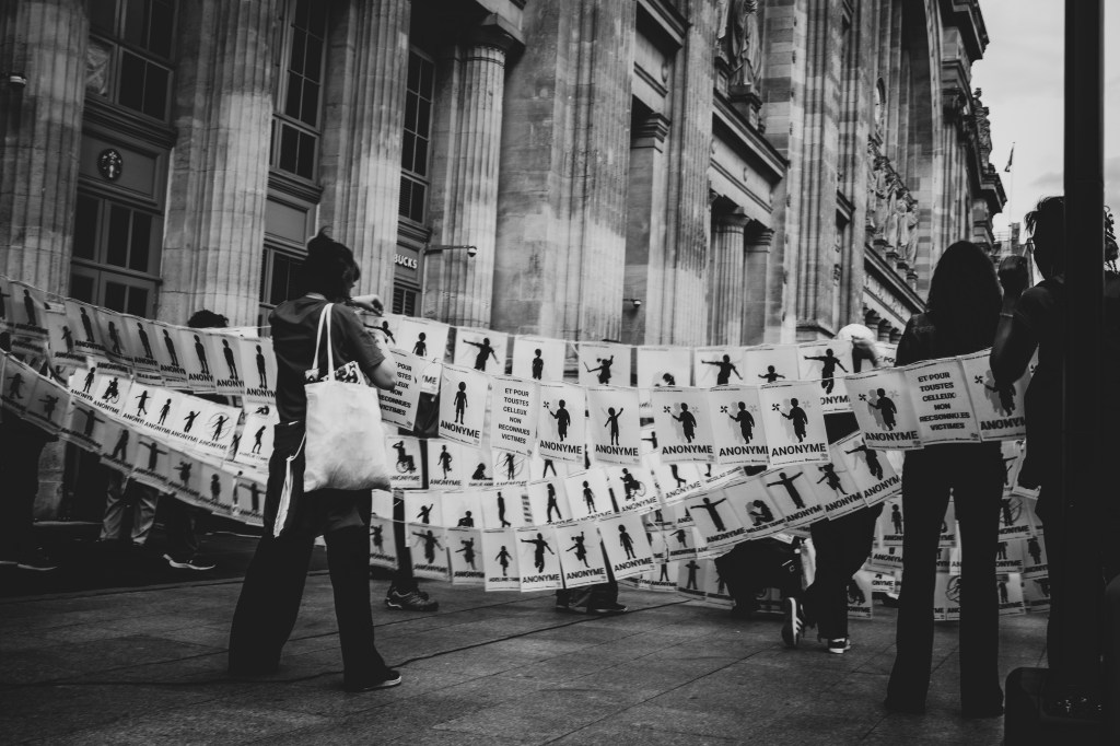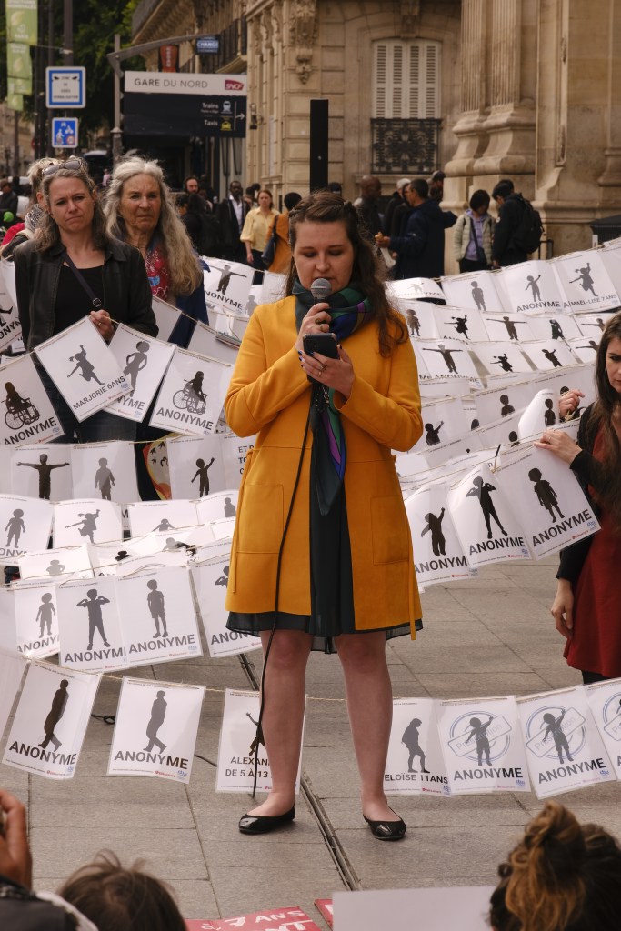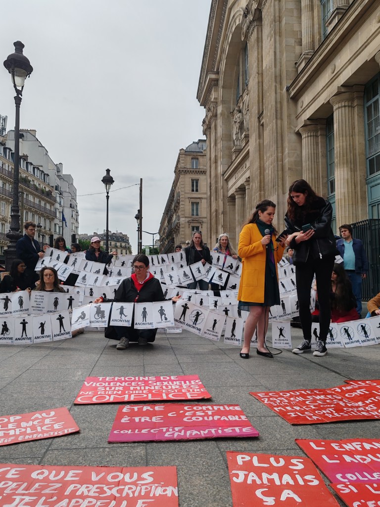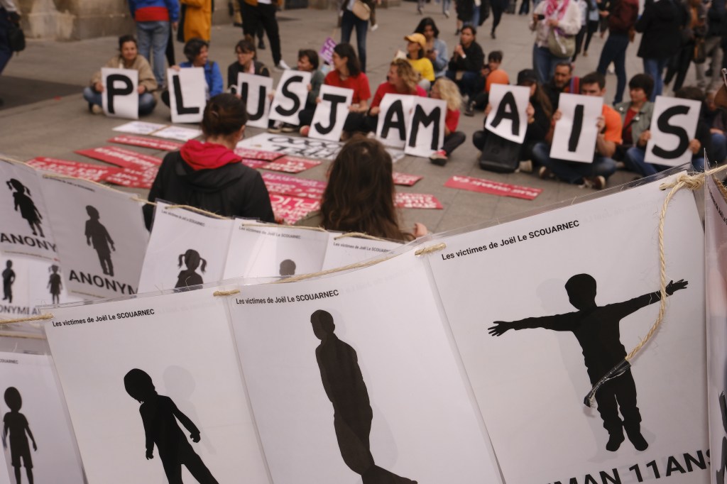 Sur le parvis, tout le monde est assis, pancartes levées, dans un silence tendu. Les voix des survivant·es s’élèvent, puissantes et dignes. Pendant trente minutes, elles racontent, dénoncent, exigent. Derrière elles, des activistes tiennent le décompte des victimes de Le Scouarnec, rappelant l’ampleur vertigineuse de l’affaire.