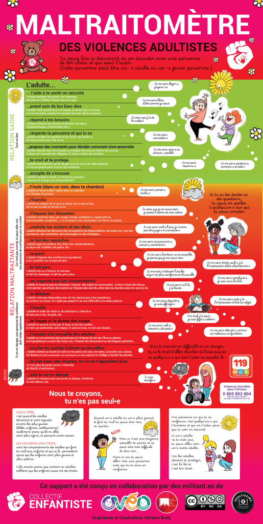 Pour aider les parents, profs ou professionnel•les de l’enfance à utiliser le maltraitomètre nous proposons un document d’accompagnement (à télécharger ci-dessous).