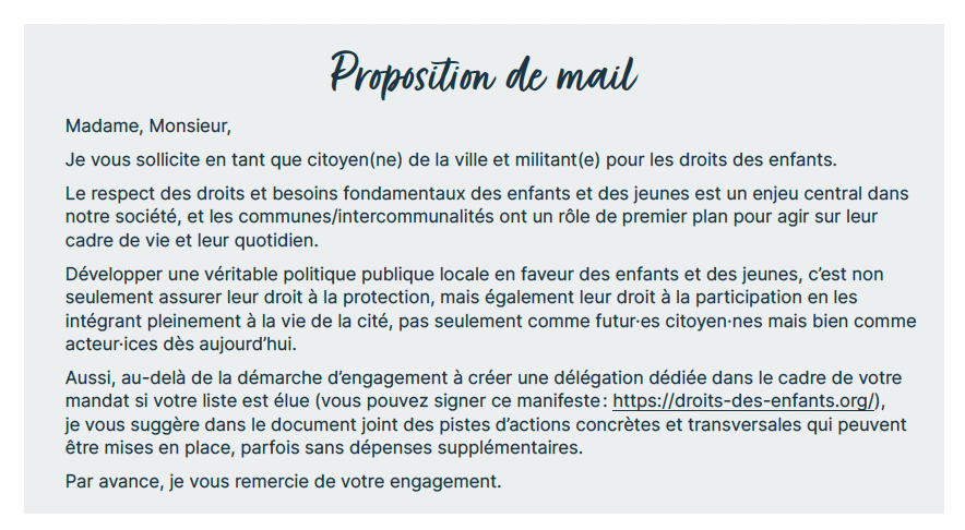 - Envoyez le mail proposé, accompagné du document « Pour une commune enfantiste »